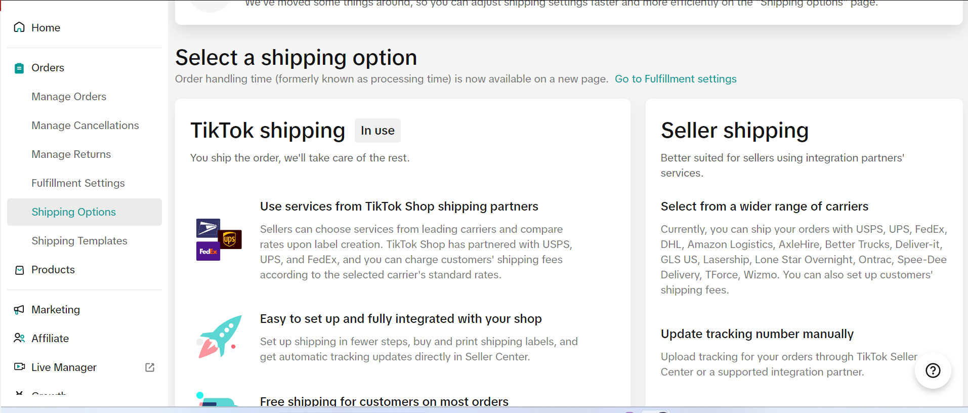 For the shipping options, if you will be pushing the orders from TikTok to shopify, you want to select seller shipping. If you buy shipping labels from TikTok then select Tiktok Shipping.