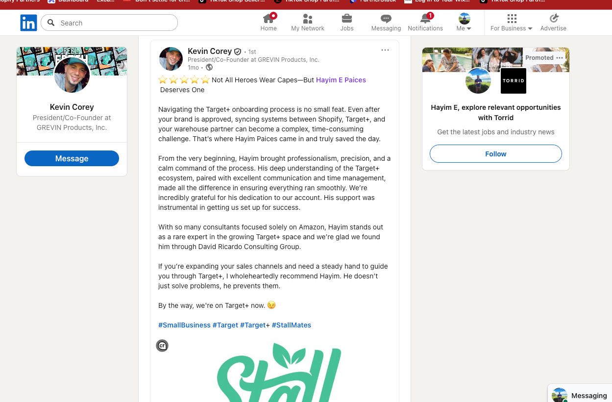 David Ricardo was approached by a Stall Mates who sells feminine hygiene products online. They had just launched on Target+ and were facing a critical issue: tracking numbers were not being pushed into Target+, resulting in canceled orders and lost revenue. To make matters worse, their seller score was dropping due to these fulfillment problems.