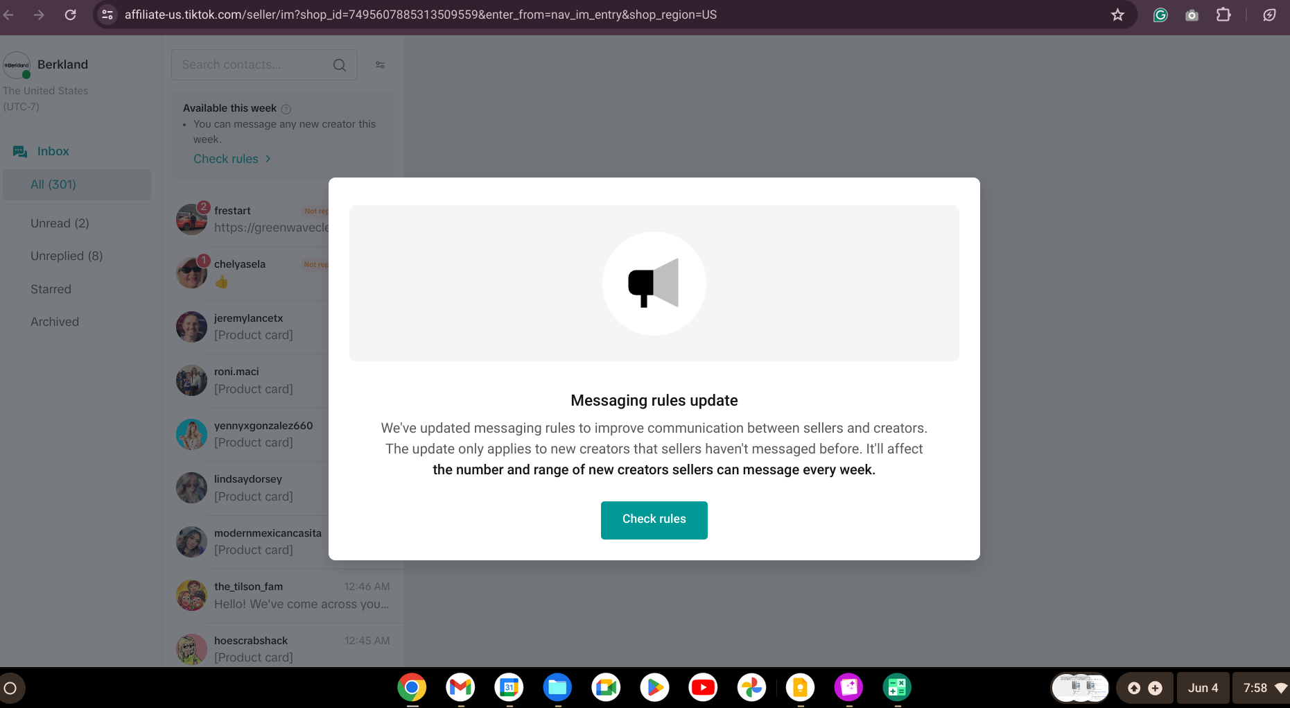 My team was reaching out to creators on June 4 when a notification letting us know about the new messaging rule update popped up. We then found out we had reached the limit.