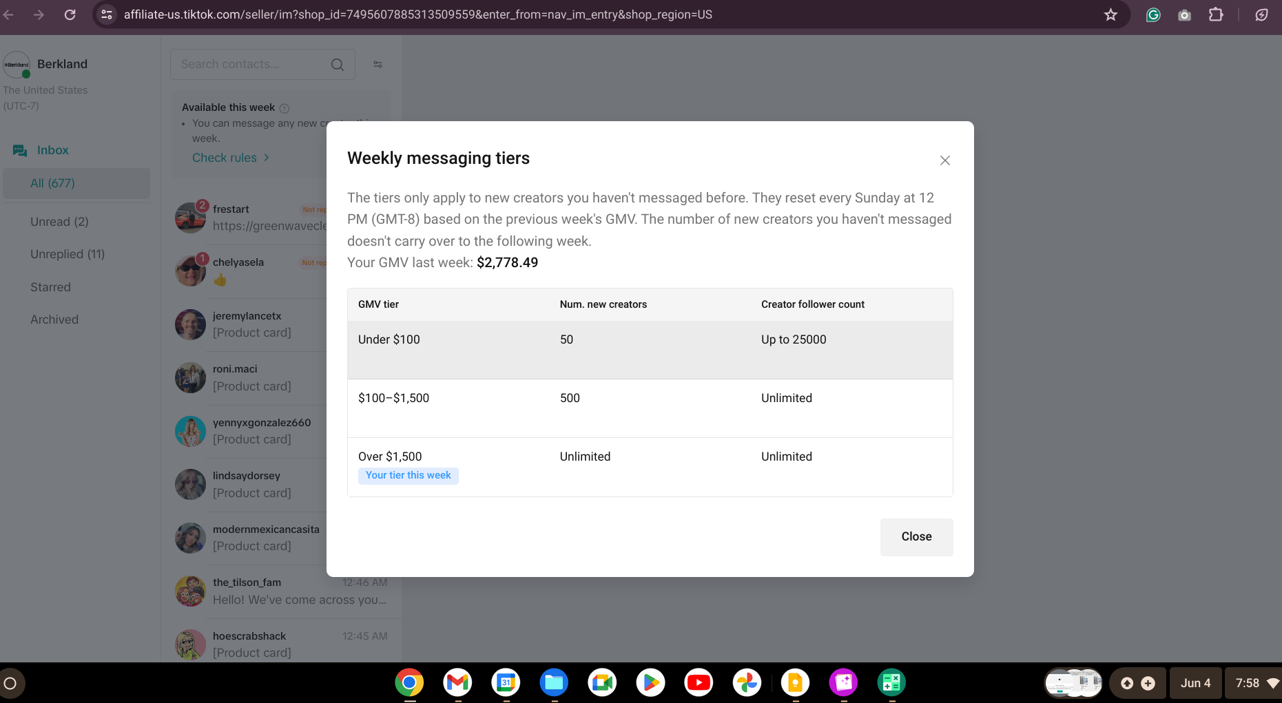 Message: The tiers only apply to new creators you haven't messaged before. They reset every Sunday at 12 PM (GMT-8) based on the previous week's GMV. The number of new creators you haven't messaged doesn't carry over to the following week.Your GMV last week: $189.00